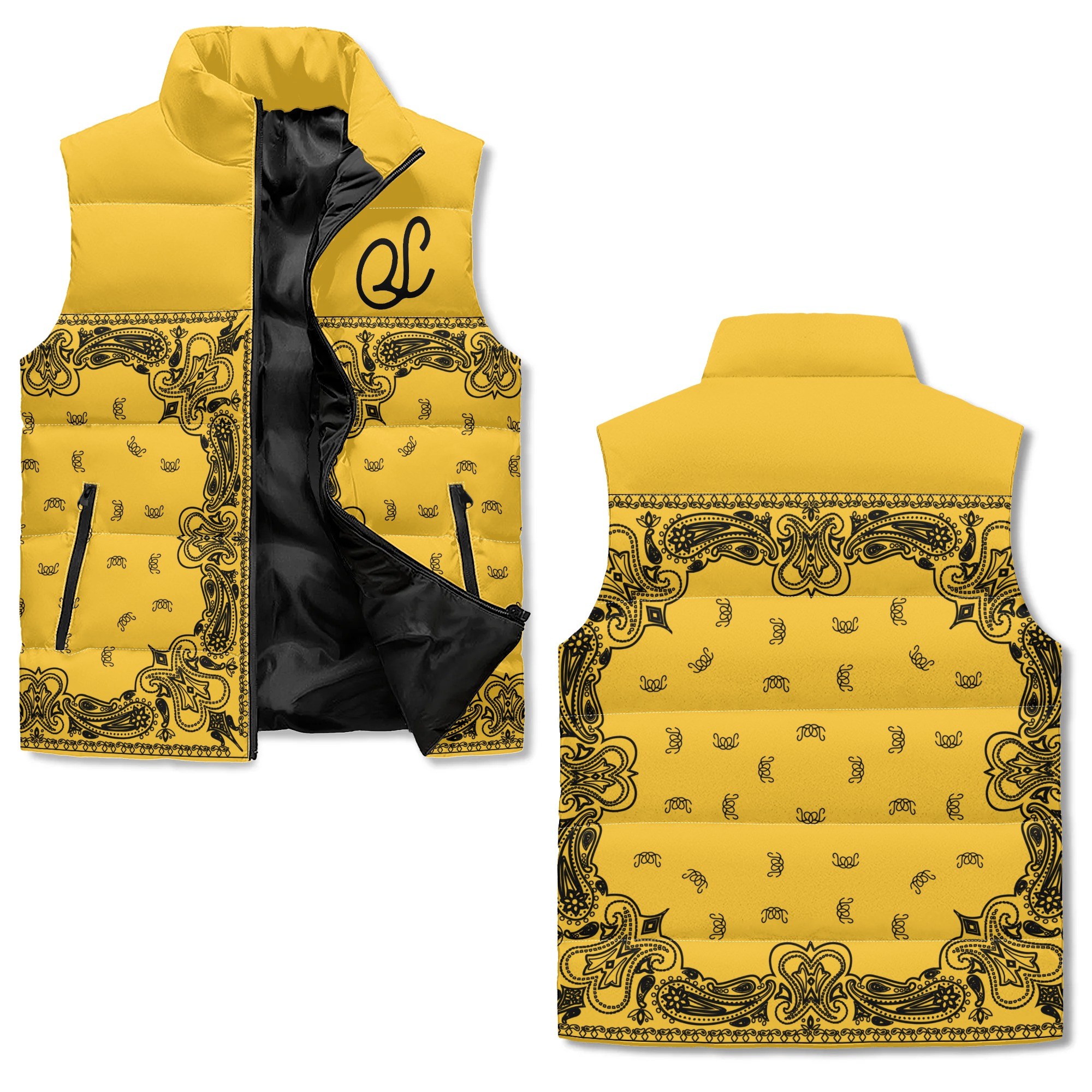 The Golden Block Paisley Silhouette Puffer Vest features subtle black-on-yellow paisley and a tonal varsity “S,” creating a sleek, understated statement. Lightweight insulation, quilted structure, and dual pockets keep it functional and street-ready, perfect for completing your Culture Pack collection.